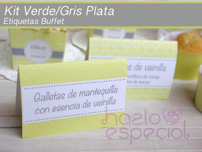 Con este Kit puedes decorar y personalizar una mesa Bautizo y/o Baby Shower. El color verde y detalles en gris.